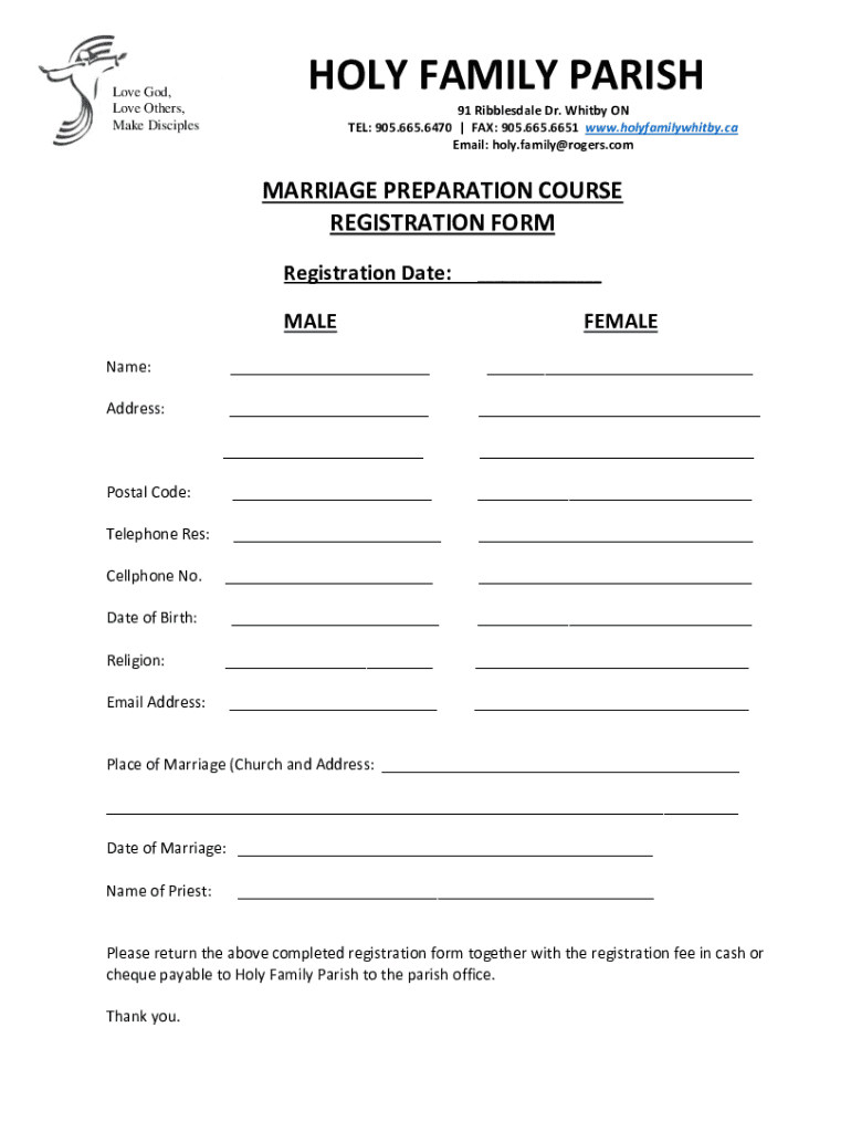 Love God, Love Others, Make Discipleship FAMILY PARISH 91 Ribblesdale Dr. Whitby ON TEL: 905.665.6470 FAX: 905.665.6651 www.holyfamilywhitby.ca Email: holy. Family rogers. Marriage PREPARATION COURSE