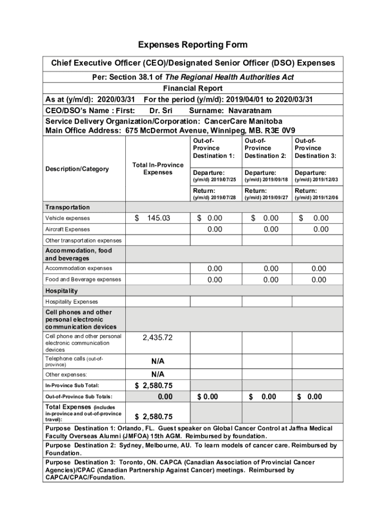 Expenses Reporting Form Chief Executive Officer (CEO)/Designated Senior Officer (DSO) Expenses Per: Section 38.1 of The Regional Health Authorities Act Financial Report As at (y/m/d): 2020/03/31 For