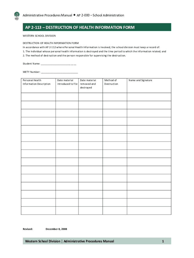 Administrative Procedures Manual AP 2000 School Administration AP 2113 DESTRUCTION OF HEALTH INFORMATION FORM WESTERN SCHOOL DIVISION DESTRUCTION OF HEALTH INFORMATION FORM In accordance with AP 2112