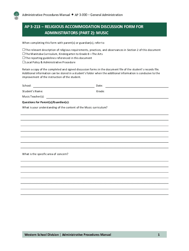 Administrative Procedures Manual AP 3000 General Administration AP 3213 RELIGIOUS ACCOMMODATION DISCUSSION FORM FOR ADMINISTRATORS (PART 2): MUSIC When completing this form with parent(s) or guardian(s),