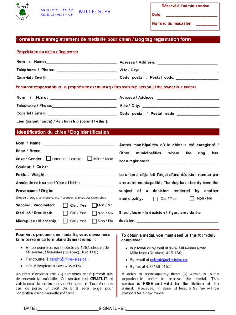 Serve ladministrationMUNICIPLIT DE MUNICIPALITY Date : Humor Du Dillon : Formula ire denregistrement de Braille pour chain / Dog tag registration form Proprietary Du chain / Dog owner Not/Name: Address