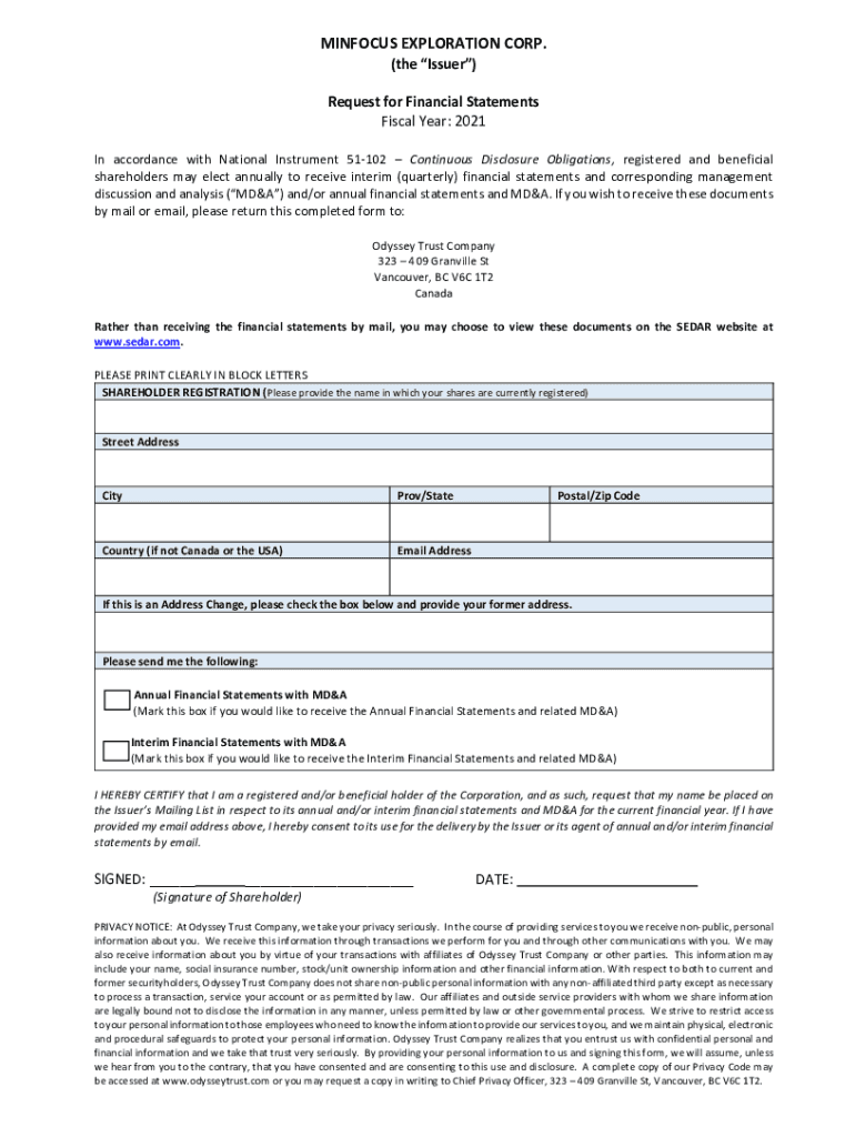UNFOCUS EXPLORATION CORP. (the Issuer)Request for Financial Statements Fiscal Year: 2021 In accordance with National Instrument 51102 Continuous Disclosure Obligations, registered and beneficial shareholders