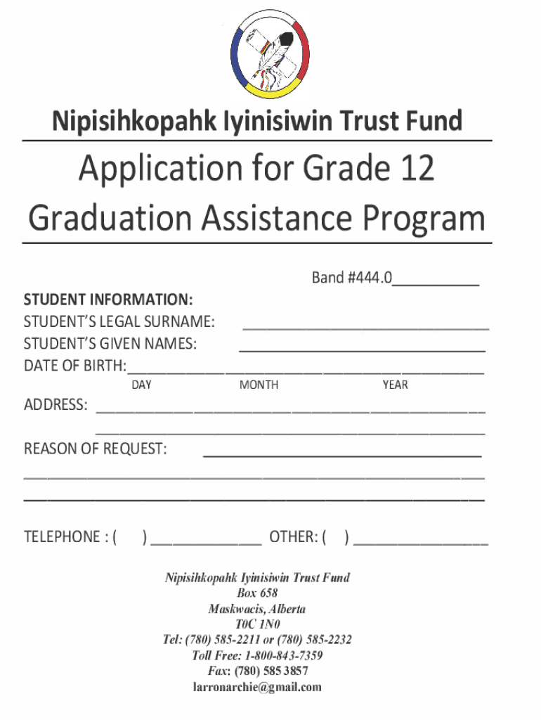 Nipisihkopahk lyinisiwin Trust FundApplication for Grade 12 Graduation Assistance Program Band #444.0STUDENT INFORMATION: STUDENT IS LEGAL SURNAME: STUDENT IS GIVEN NAMES: DATE OF BIRTH: ADDRESS:DAYMONTHYEARREASON