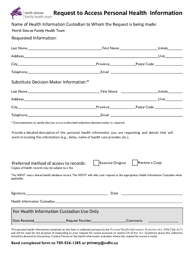 Request to Access Personal Health Information Name of Health Information Custodian to Whom the Request is being made: North Since Family Health TeamRequested Information: First Nameless NameInitialsAddressUnitCityProvinceTelephonePostal