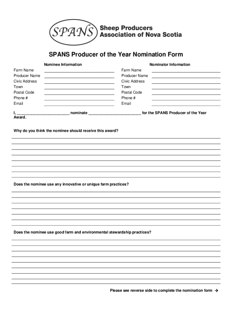 SPANS Producer of the Year Nomination Form Nominee InformationNominator Informational Name Producer Name Civic Address Town Postal Code Phone # EmailFarm Name Producer Name Civic Address Town Postal