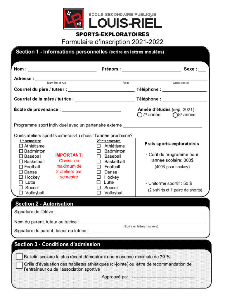 SPORTSEXPLORATOIRESFormulaire inscription 20212022 Section 1 Information personnel (crime en letters modules) Not : Prom : See : Address : Humor et rueVilleCode postalCourriel Du PRE / auteur : Tl