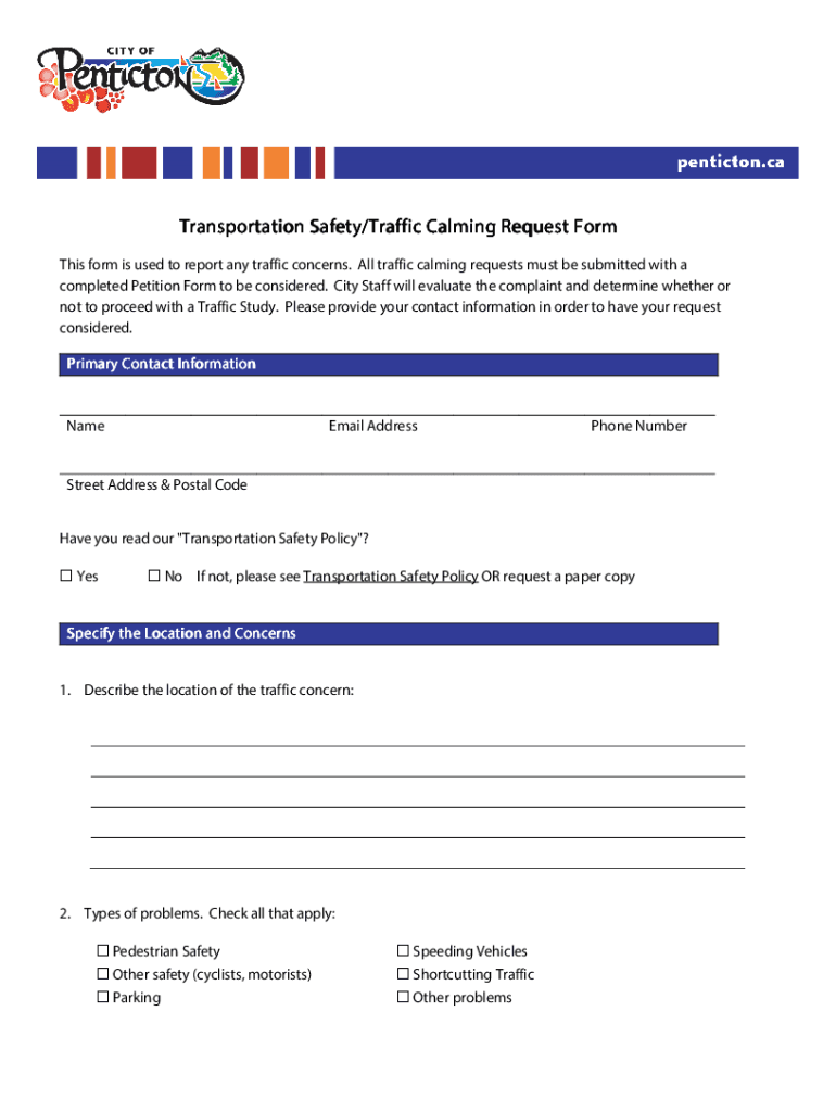 Transportation Safety/ Safety/Traffic Calming Request Form This form is used to report any traffic concerns. All traffic-calming requests must be submitted with a completed Petition Form to be considered.