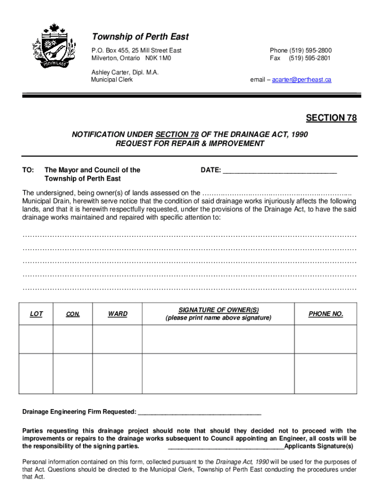 Township of Perth East P.O. Box 455, 25 Mill Street East Silverton, Ontario N0K 1M0 Ashley Carter, Dial. M.A. Municipal Cellphone (519) 5952800 Fax (519) 5952801 email Carter northeast. Section 78