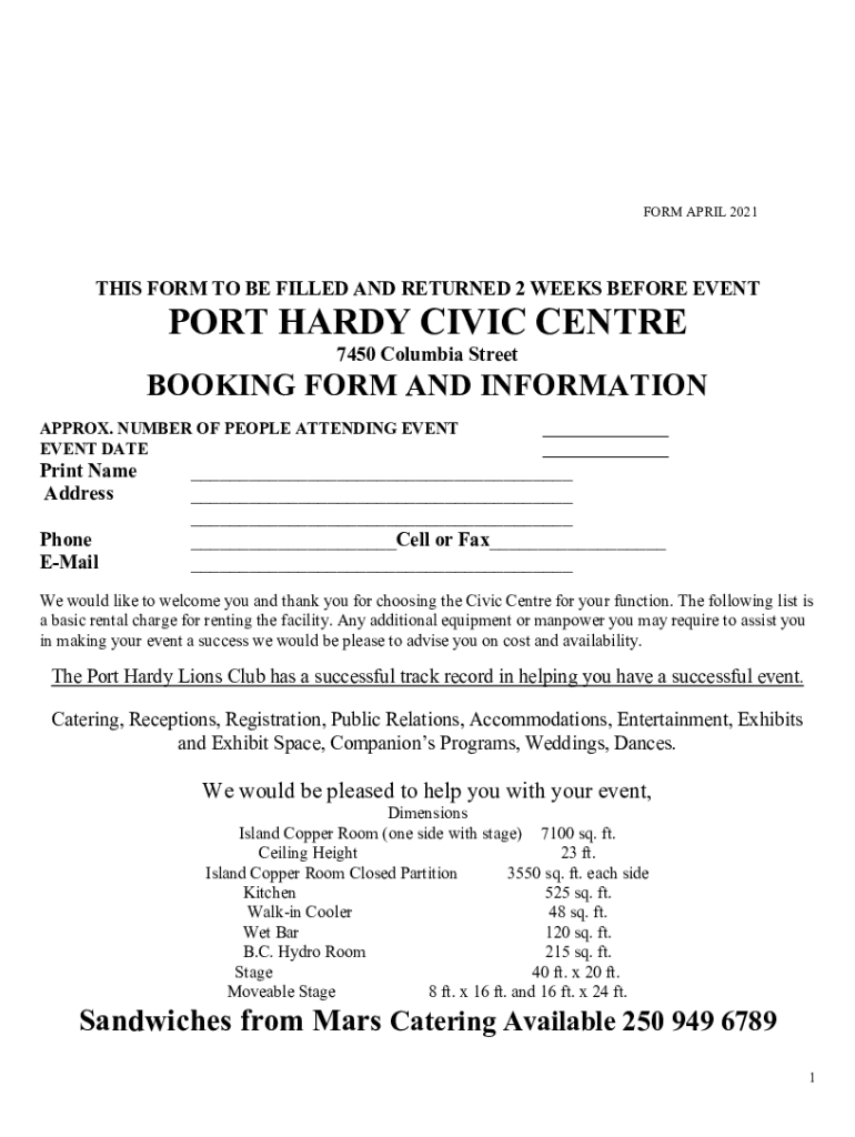 FORM APRIL 2021THIS FORM TO BE FILLED AND RETURNED 2 WEEKS BEFORE DAVENPORT HARDY CIVIC Center 7450 Columbia StreetBOOKING FORM AND INFORMATION APPROX. NUMBER OF PEOPLE ATTENDING EVENT Catering Name