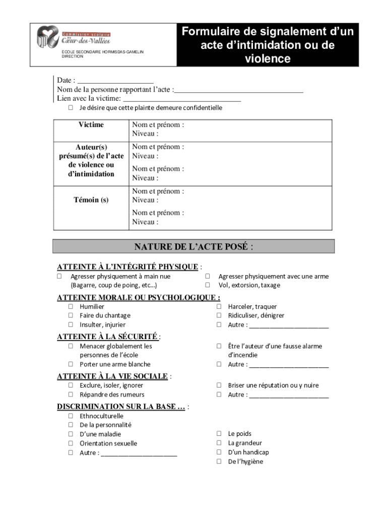 COLE SECONDARY HORMISDASGAMELIN DIRECTIONFormulaire de signalmen dun acted intimidation of de violenceDate : Not DE la personnel rapport ant late : Lien Alec la victim: Jed sire Que Bette plaint demure