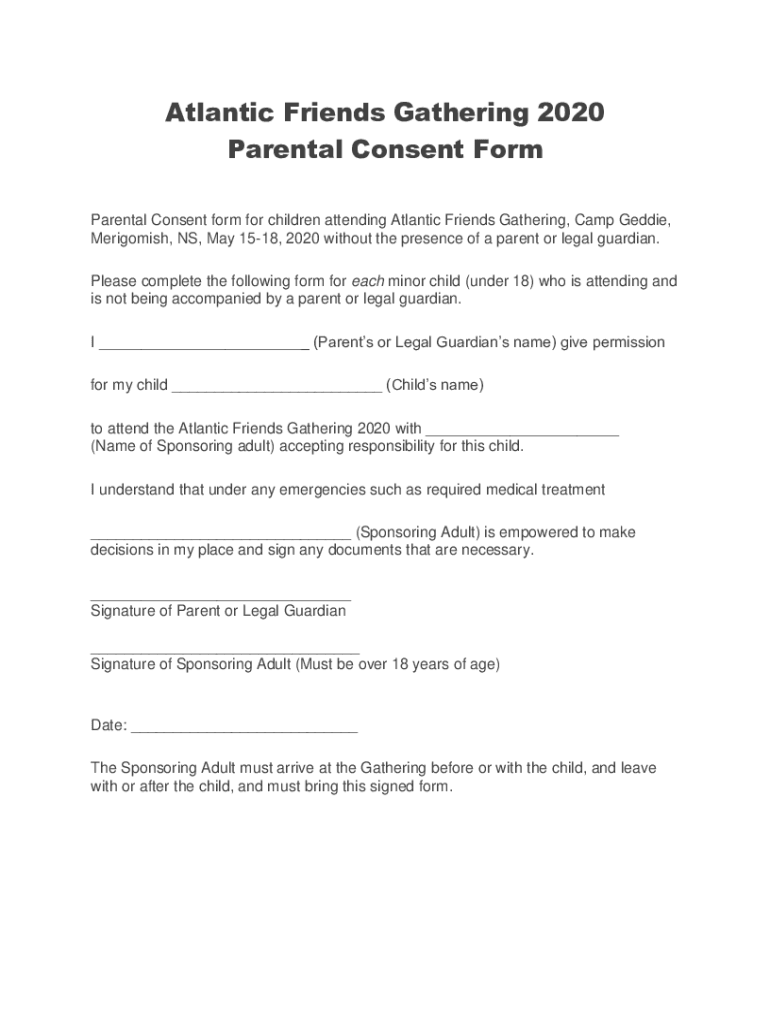 Atlantic Friends Gathering 2020 Parental Consent Form Parental Consent form for children attending Atlantic Friends Gathering, Camp Eddie, Merigomish, NS, May 1518, 2020 without the presence of a