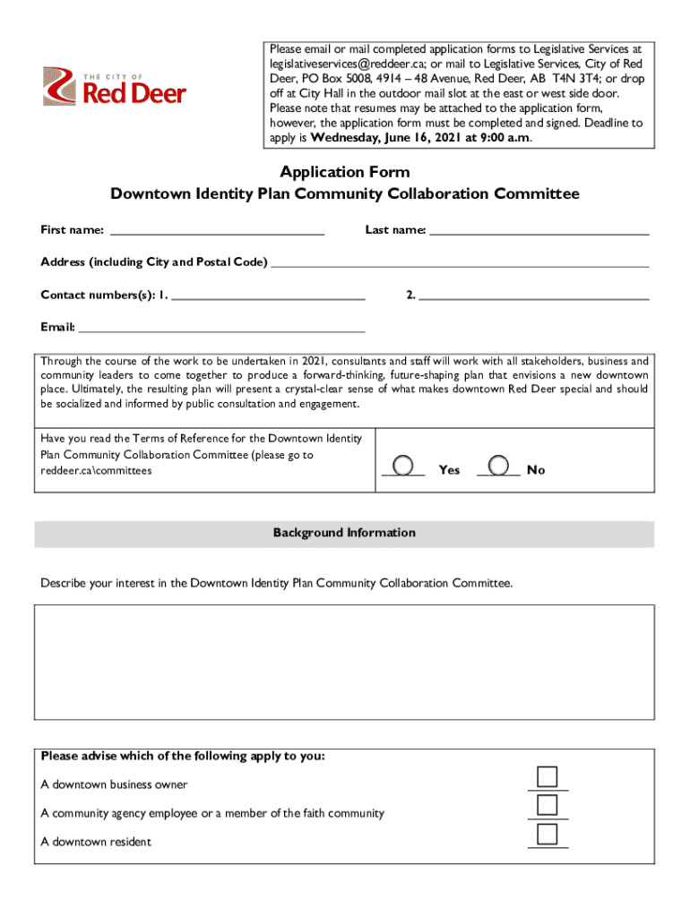 Please email or mail completed application forms to Legislative Services at legislativeservices@reddeer.ca; or mail to Legislative Services, City of Red Deer, PO Box 5008, 4914 48 Avenue, Red Deer,