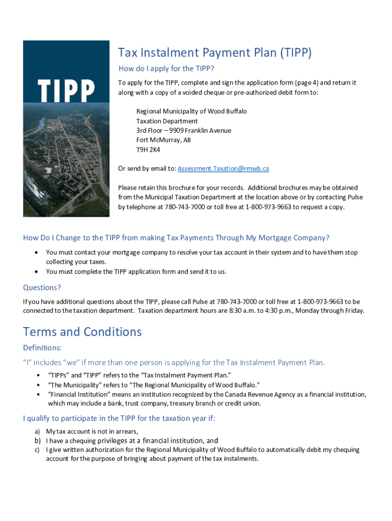 TaxInstalmentPaymentPlan(TIPP) HowdoIapplyfortheTIPP? ToapplyfortheTIPP, completeandsigntheapplicationform(page4)andreturnit alongwithacopyofavoidedchequeorpreauthorizeddebitformto: RegionalMunicipalityofWoodBuffalo