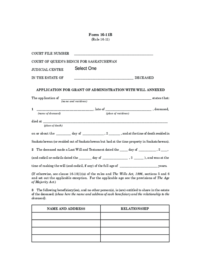Form 1611B (Rule 1611)COURT FILE NUMBER COURT OF QUEEN'S BENCH FOR SASKATCHEWAN JUDICIAL CENTRESelect One IN THE ESTATE OF DECEASEDAPPLICATION FOR GRANT OF ADMINISTRATION WITH WILL Annex The application