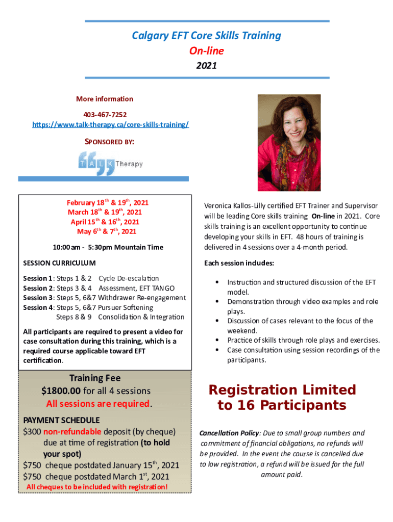 Calgary EFT Core Skills Training Online 2021 More information 4034677252 https://www.talktherapy.ca/coreskillstraining/SPONSORED BY:February 18th & 19th, 2021 March 18th & 19th, 2021 April 15th &
