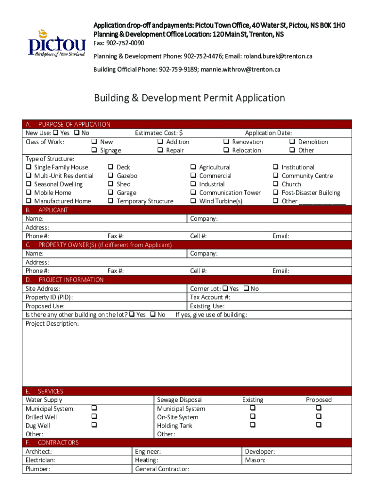 Application drop-off and payments: Victor Town Office, 40 Water St, Victor, NS B0K 1H0 Planning & Development Office Location: 120 Main St, Trenton, NSF ax: 9027520090Planning & Development Phone: