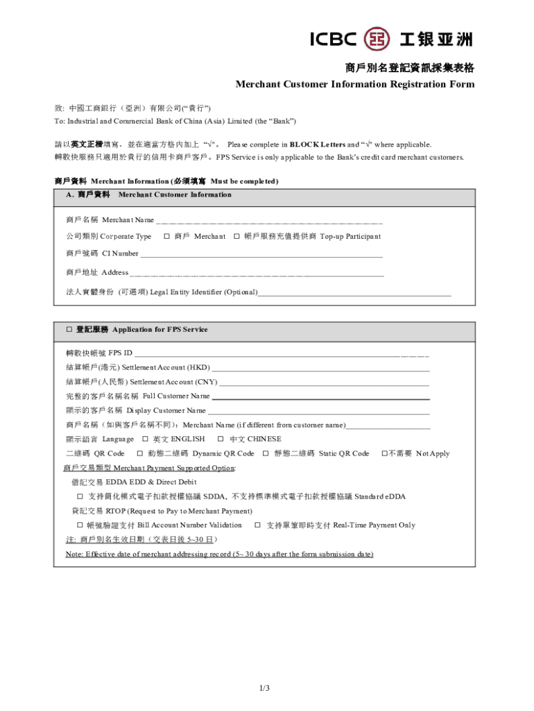 Merchant Customer Information Registration Form : () To: Industrial and Commercial Bank of China (Asia) Limited (the Bank) Please complete in BLOCK Letters and where applicable. FPS Service is only