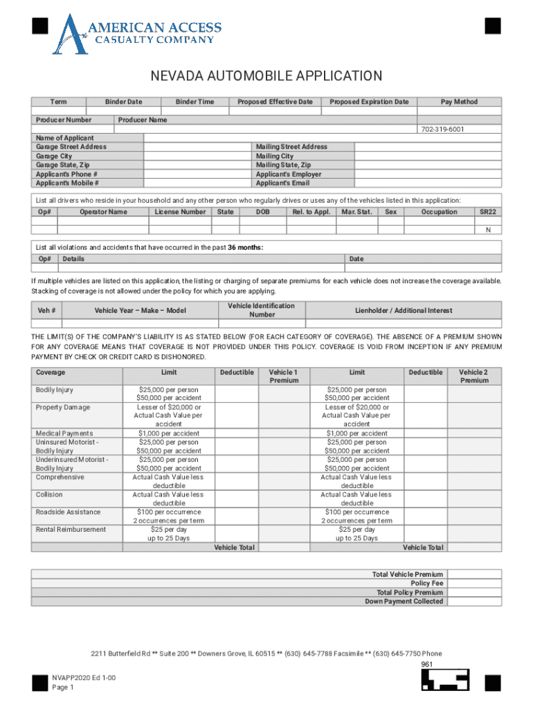 NEVADA AUTOMOBILE APPLICATION Remainder Reproducer NumberBinder TimeProposed Effective DateProposed Expiration Gateway MethodProducer Name 7023196001Name of Applicant Garage Street Address Garage