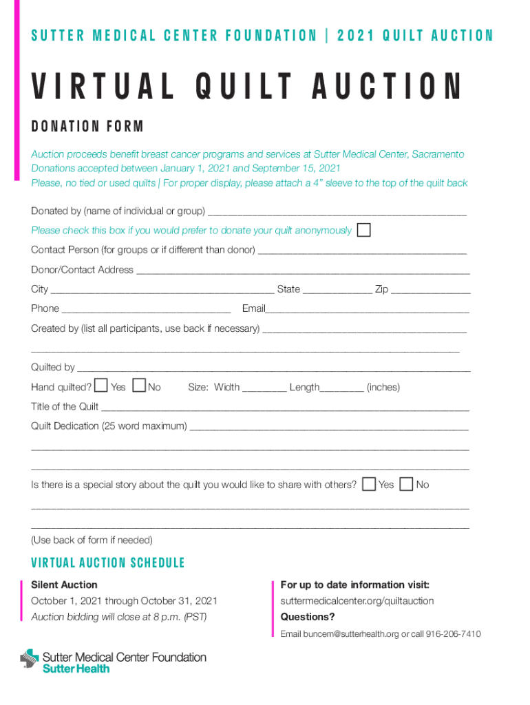 S U T T E R M E D I C A L C E N T E R F O U N D AT I O N 2 0 2 1 Q U I LT A U C T I ON VIRTUAL EU I LT AU CT I O N DONATION FORM Auction proceeds benefit breast cancer programs and services at Sutter