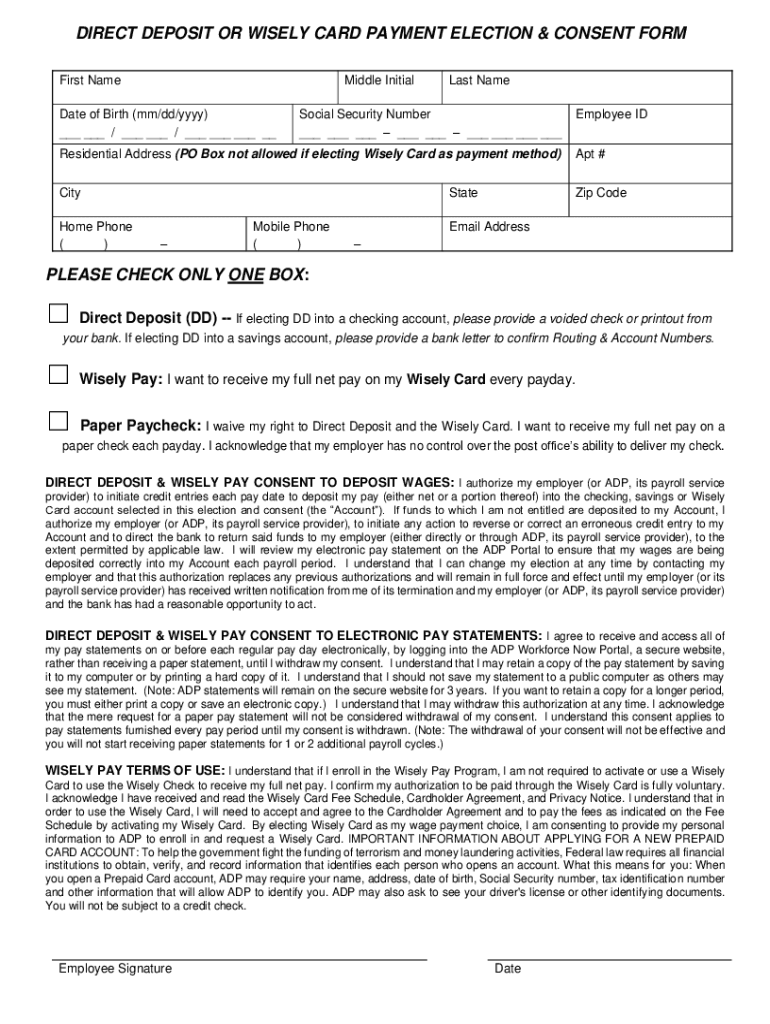 DIRECT DEPOSIT OR WISELY CARD PAYMENT ELECTION & CONSENT FORM First NameMiddle Initiate of Birth (mm/dd/YYY) / / Last Asocial Security Number Employee Presidential Address (PO Box not allowed if electing