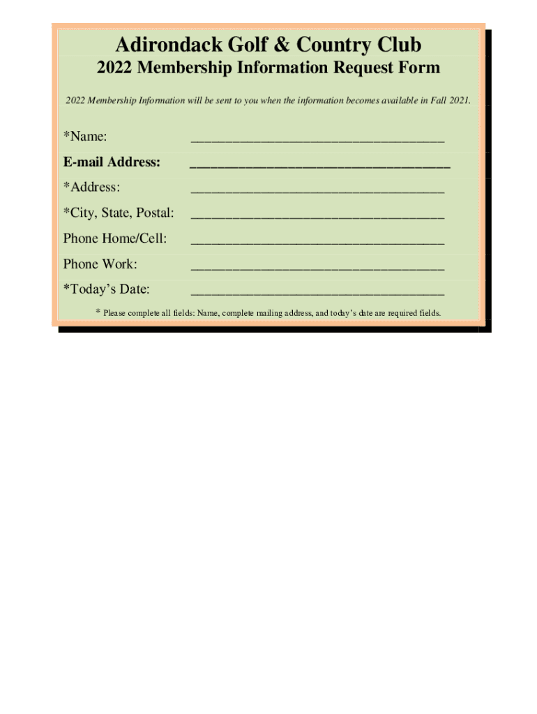 Adirondack Golf & Country Club 2022 Membership Information Request Form 2022 Membership. Information will be sent to you when the information becomes available in Fall 2021. Name: Email Address: *Address: