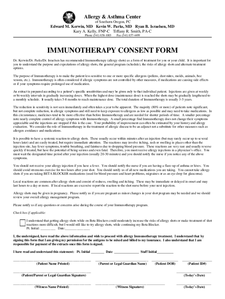 Allergy & Asthma Center of Southern Oregon, PC Edward M. Erwin, MD Kevin W. Parks, MD Ryan B. Israel sen, MD Mary A. Kelly, FNPC Tiffany R. Smith, PAC Phone (541) 8581003Fax (541) 8574499IMMUNOTHERAPY