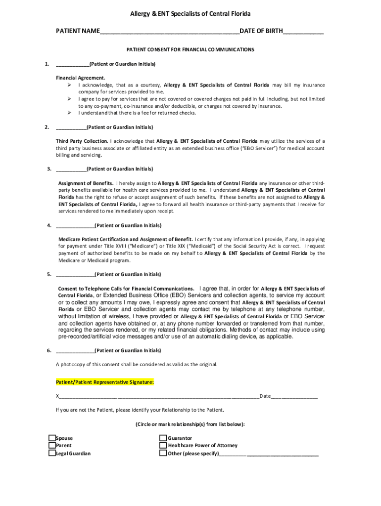 Allergy & ENT Specialists of Central Florida PATIENT NAME DATE OF BIRTH PATIENT CONSENT FOR FINANCIAL COMMUNICATIONS 1. (Patient or Guardian Initials) Financial Agreement. I acknowledge, that as a