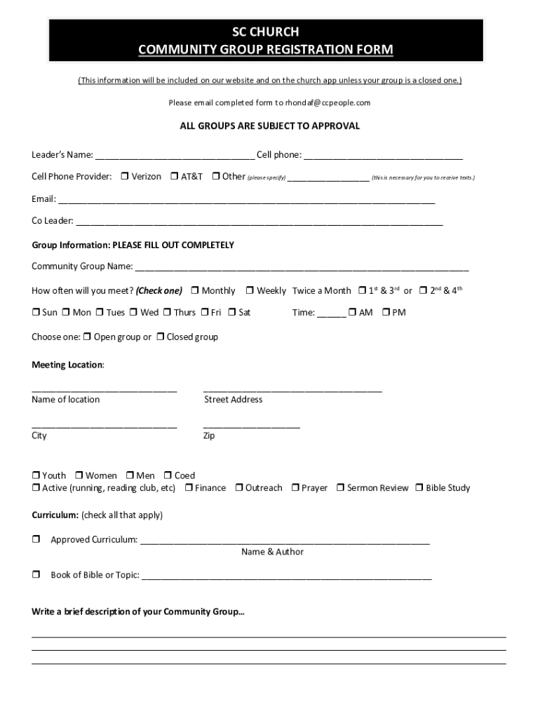 SC CHURCH COMMUNITY GROUP REGISTRATION FORM (This information will be included on our website and on the church app unless your group is a closed one.) Please email completed form to Rhonda cc people.com