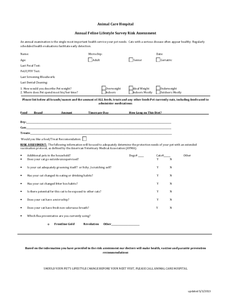 Animal Care Hospital Annual Feline Lifestyle Survey Risk Assessment An annual examination is the single most important health service your pet needs. Cats with a serious disease often appear healthy.