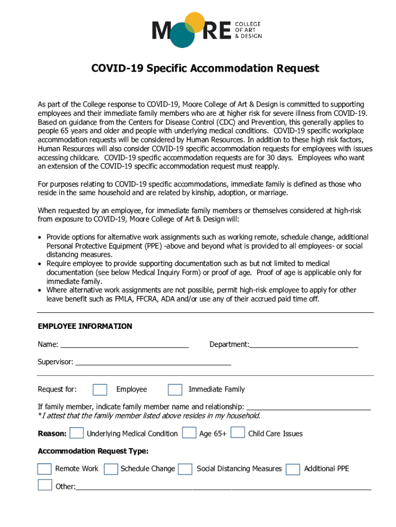 COVID-19 Specific Accommodation Request As part of the College response to COVID-19, Moore College of Art & Design is committed to supporting employees and their immediate family members who are at