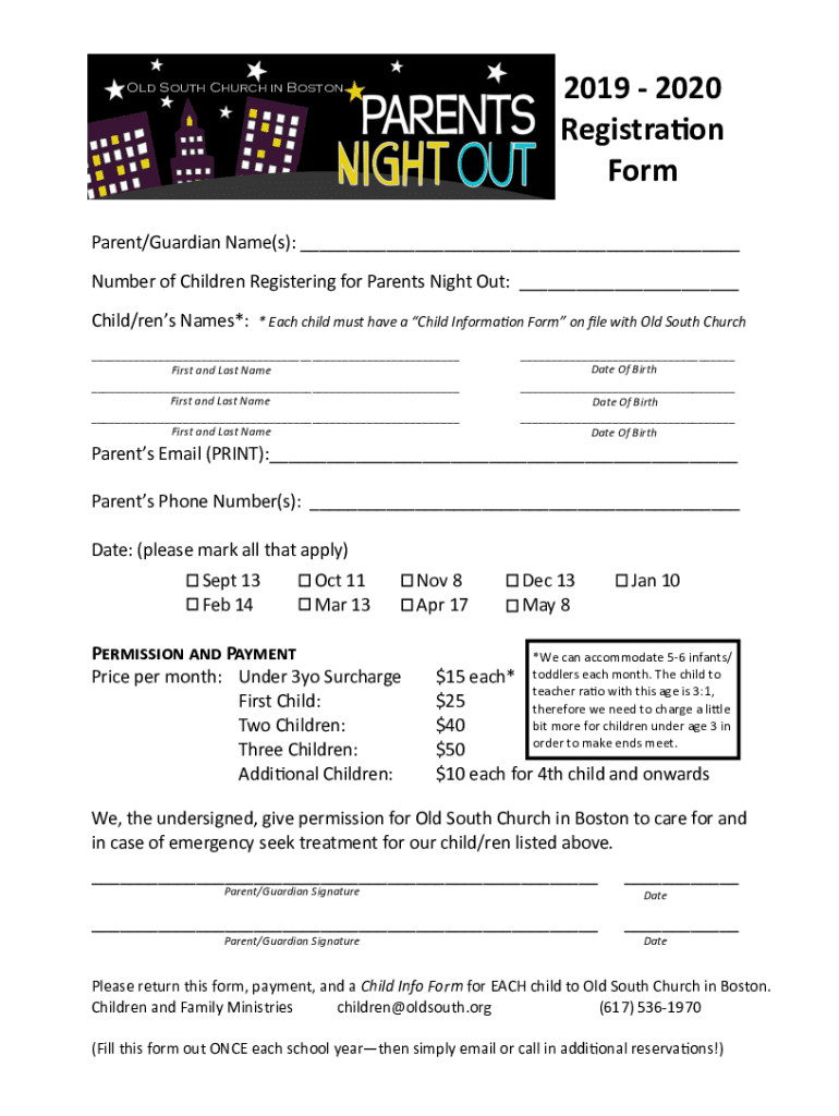 2019 2020 Registration Formed South Church in Bostonian/Guardian Name(s): Number of Children Registering for Parents Night Out: Child/runs Names*:* Each child must have a Child Information Form on
