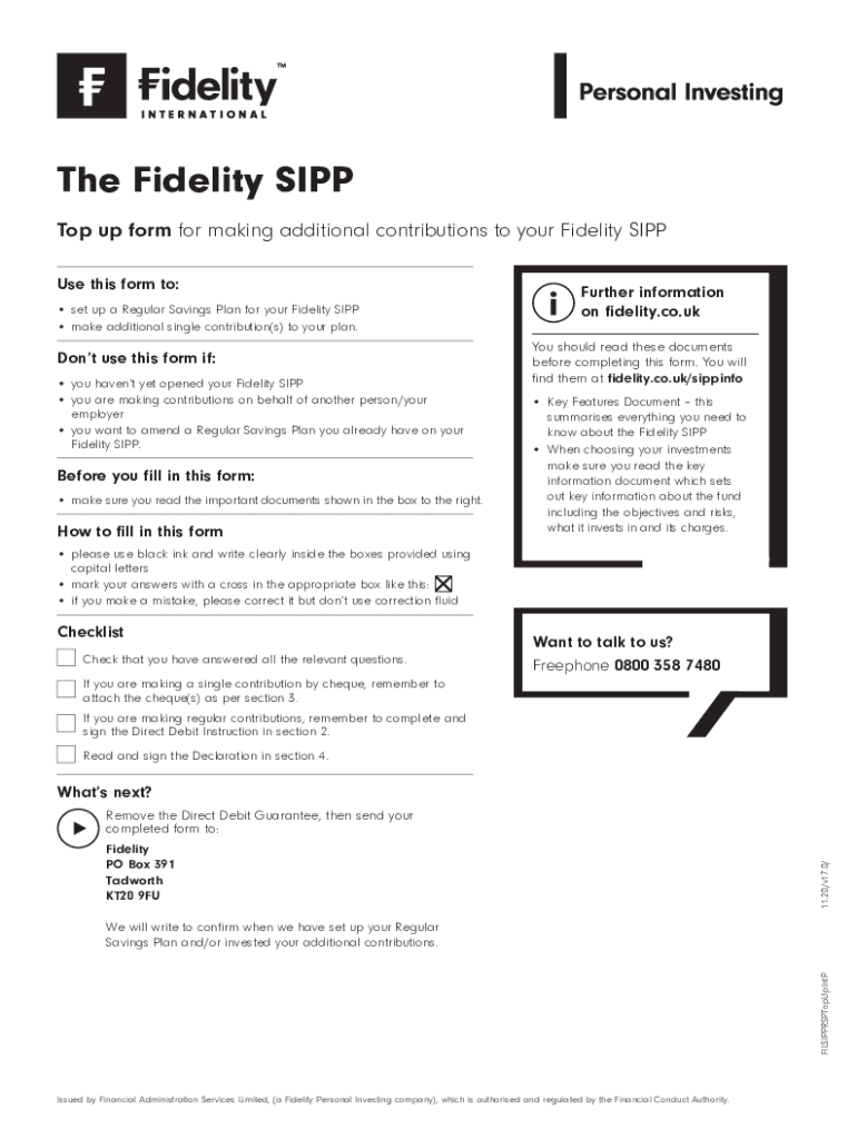 The Fidelity SIPP Top up form for making additional contributions to your Fidelity SIPP Use this form to: set up a Regular Savings Plan for your Fidelity SIPP make additional single contribution(s)