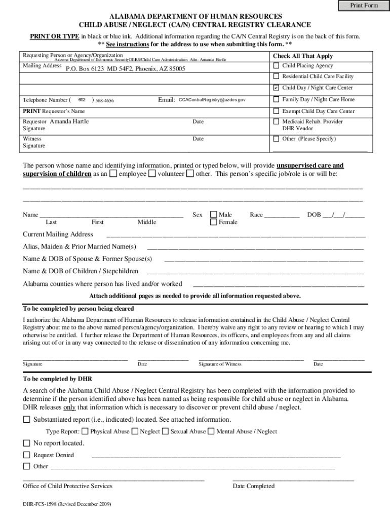 Print FormALABAMA DEPARTMENT OF HUMAN RESOURCES CHILD ABUSE / NEGLECT (CA/N) CENTRAL REGISTRY CLEARANCE PRINT OR TYPE in black or blue ink. Additional information regarding the CA/N Central Registry