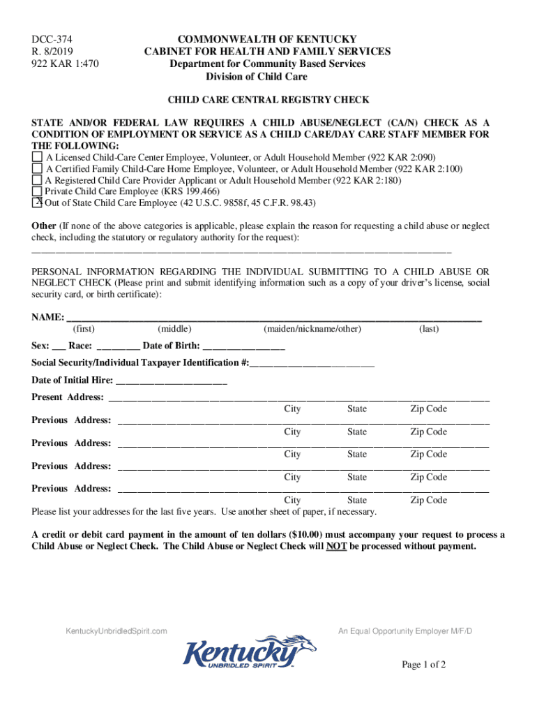 DCC374 R. 8/2019 922 Cars 1:470COMMONWEALTH OF KENTUCKY CABINET FOR HEALTH AND FAMILY SERVICES Department for Community Based Services Division of Child Care CENTRAL REGISTRY CHECKMATE AND/OR FEDERAL