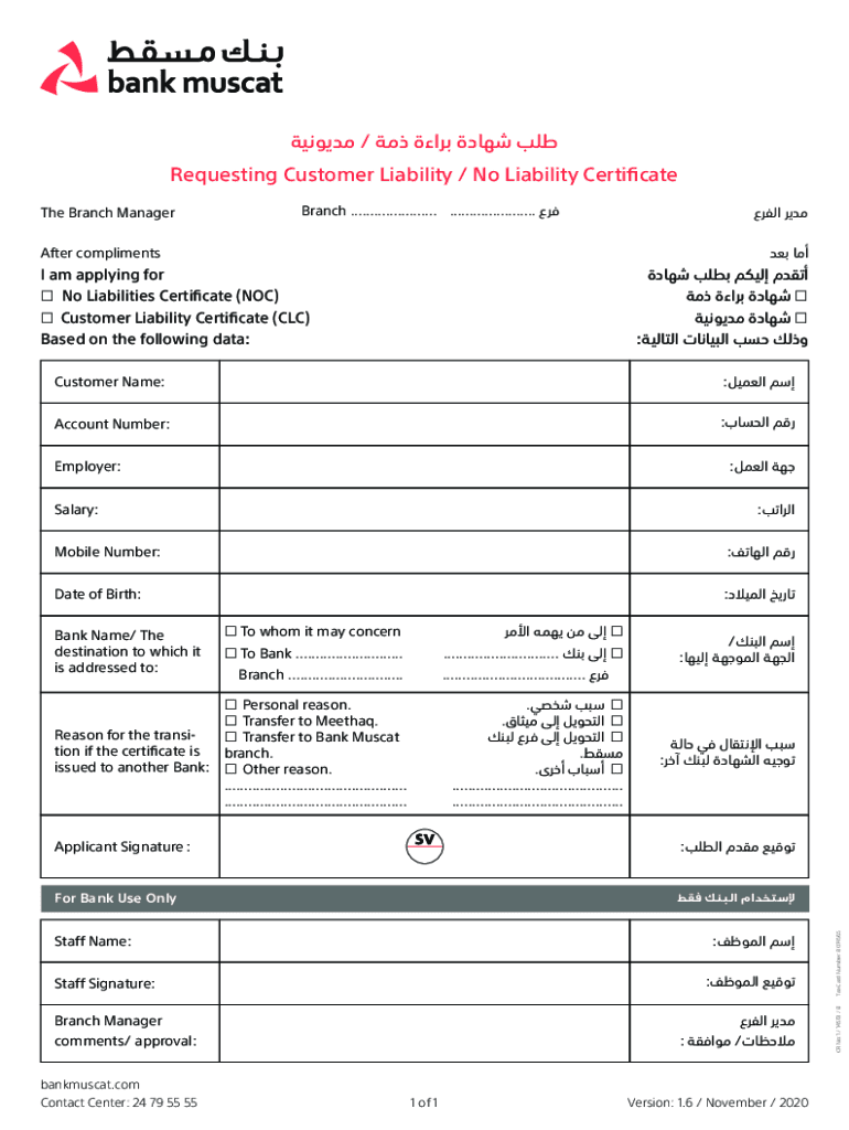 / Requesting Customer Liability / No Liability Certificate Branch ...................... ...................... After compliments : I am applying for No Liabilities Certificate (NOC) Customer Liability