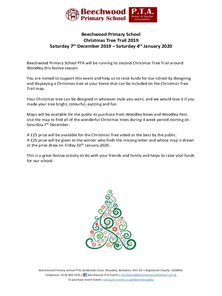 Beech wood Primary School Christmas Tree Trail 2019 TH Saturday 7 December 2019 Saturday 4th January 2020 Beech wood Primary School PTA will be running its second Christmas Tree Trail around Wooden