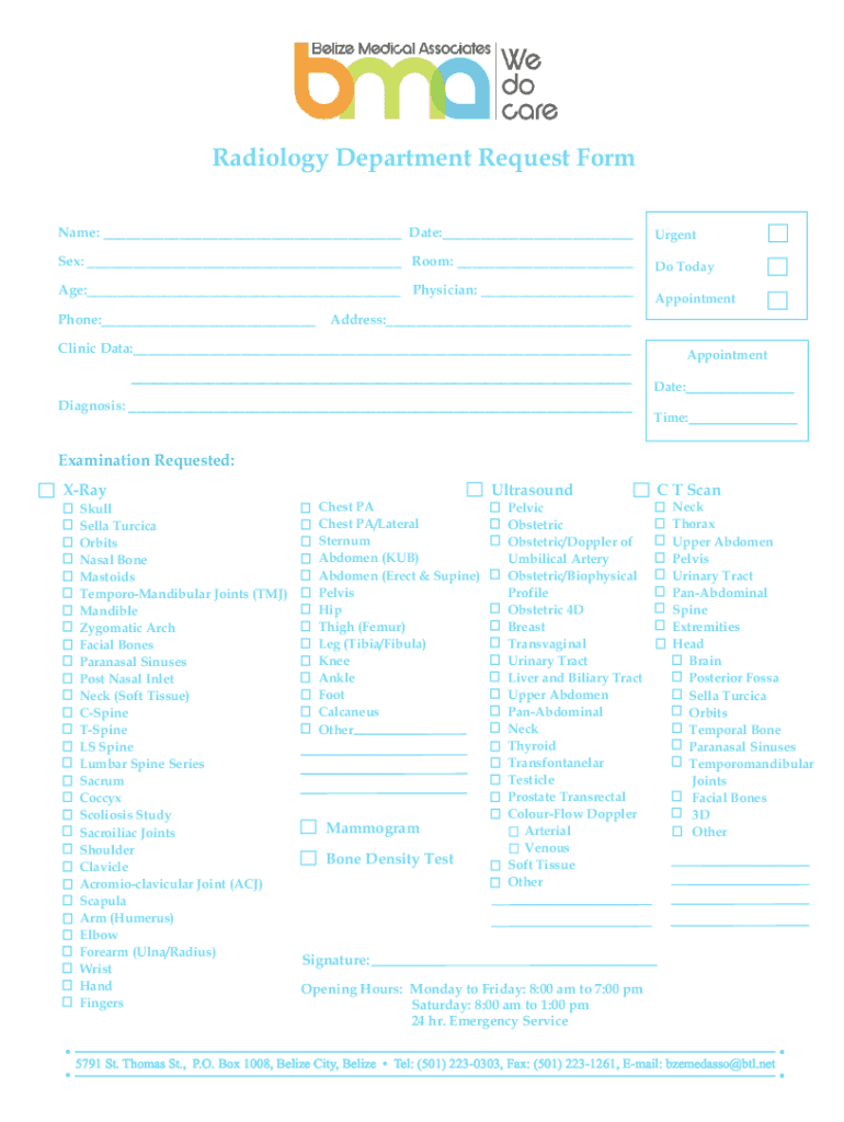 Radiology Department Request Form Name: Date: Urgent: Room: Do Today: Physician: Phone: AppointmentAddress: Clinic Data: Diagnosis: Appointment Date: Time: Examination Requested: Ray Skull Sell Turkic