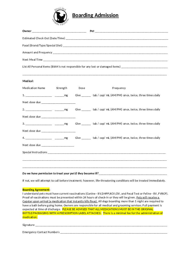 Boarding Admission Owner Pet Estimated Check Out (Date/Time) Food (Brand/Type/Special Diet) Amount and Frequency Next Meal Time List All Personal Items (BIAS is not responsible for any lost or damaged