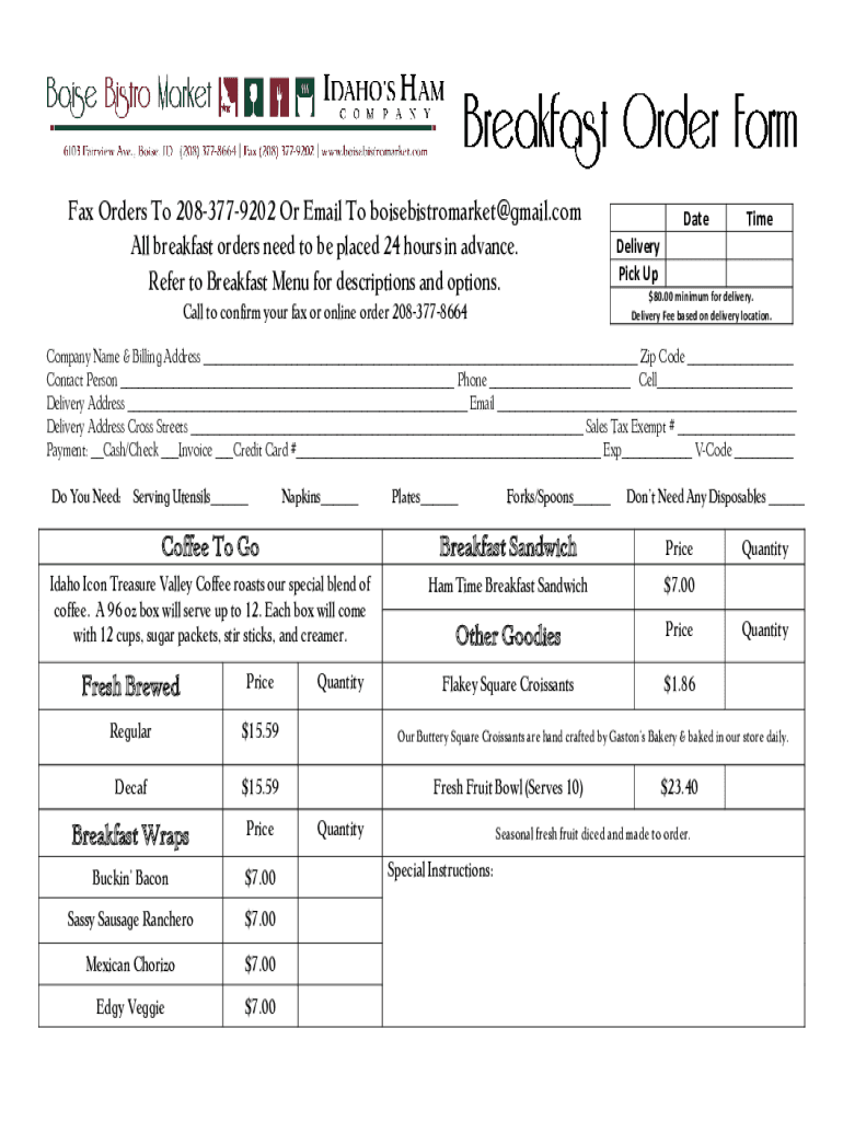 Fax Orders To 2083779202 Or Email To boisebistromarket gmail.com All breakfast orders need to be placed 24 hours in advance. Refer to Breakfast Menu for descriptions and options. Call to confirm your