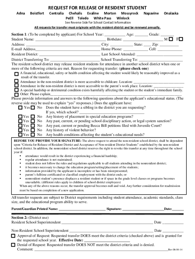 AdnaBoistfortREQUEST FOR RELEASE OF RESIDENT STUDENT CentraliaChehalis Eva line Morton Mossy rock Peel Toledo White Pass WinlockNapavineOnalaskaSee Reverse Side for School Contact Information All