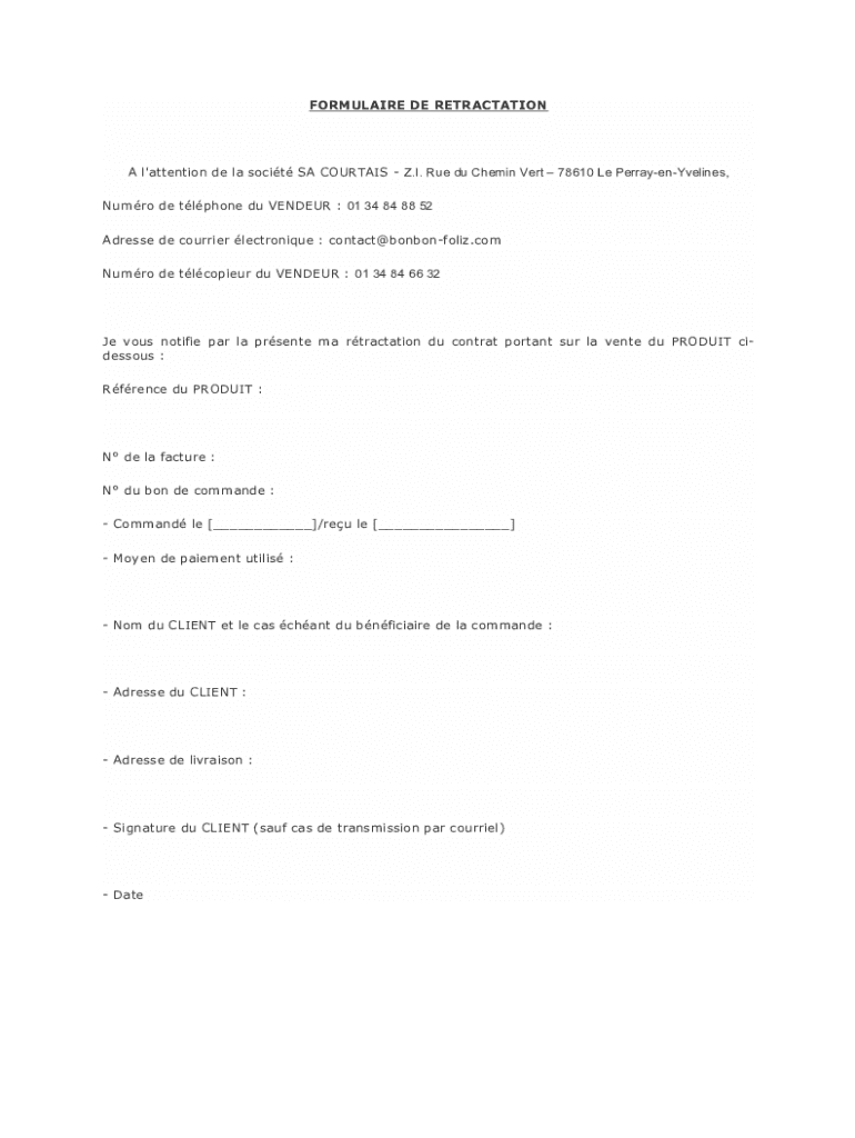 FORMULA IRE DE RETRACTION l 'attention DE la so cit SA COURT AIS Z.I. Rue du Che min Vert 78610 Le PerrayenYvelines, Humor DE phone Du VEND EUR : 01 34 84 88 52 Address DE courier Veronique : contact