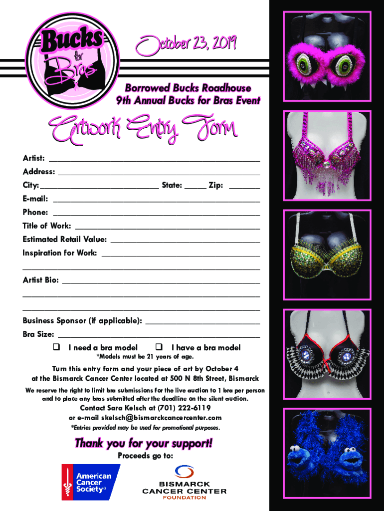 October 23, 2019, Borrowed Bucks Roadhouse 9th Annual Bucks for Bras EventArtwork Entry Formalist: Address: City: State: Zip: Email: Phone: Title of Work: Estimated Retail Value: Inspiration for Work: