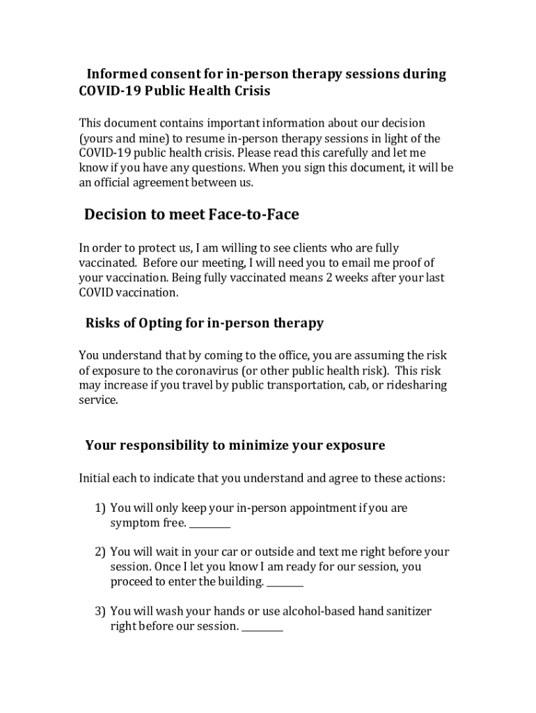 Informed consent for unperson therapy sessions during COVID-19 Public Health Crisis This document contains important information about our decision (yours and mine) to resume unperson therapy sessions