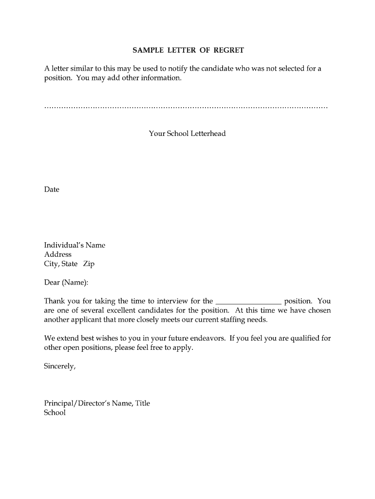 SAMPLE LETTER OF REGRET A letter similar to this may be used to notify the candidate who was not selected for a position. You may add other information. Your School Letterhead Date Individuals Name