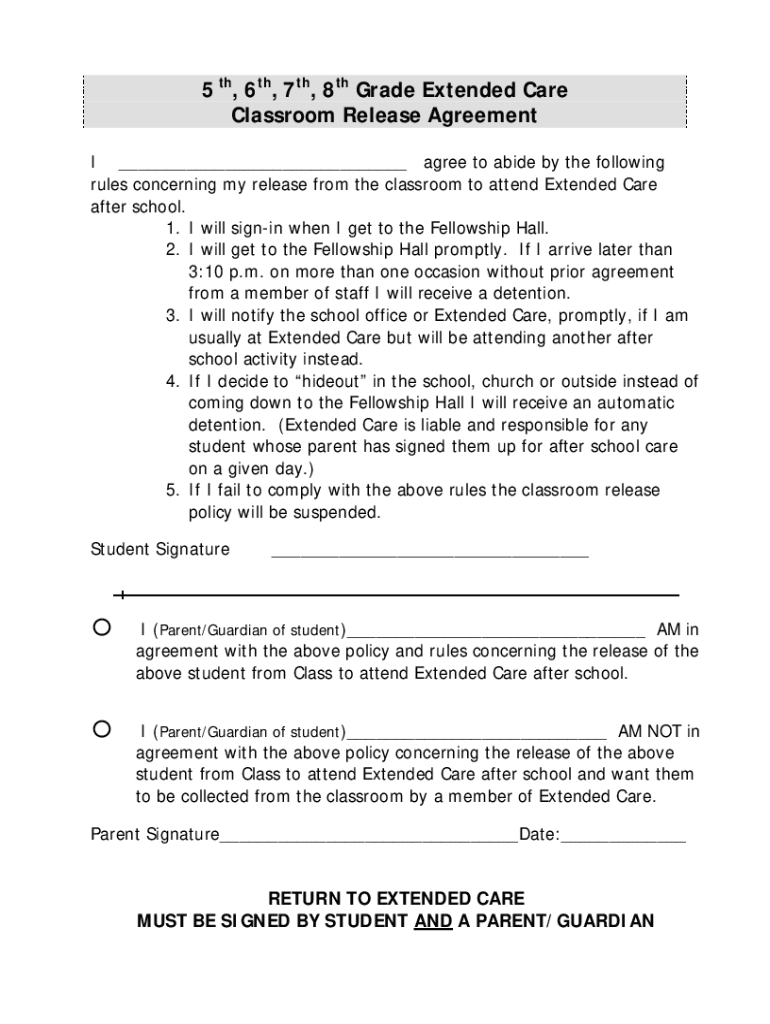 5th, 6th, 7th, 8th Grade Extended Care Classroom Release Agreement I agree to abide by the following rules concerning my release from the classroom to attend Extended Care after school. 1. I will