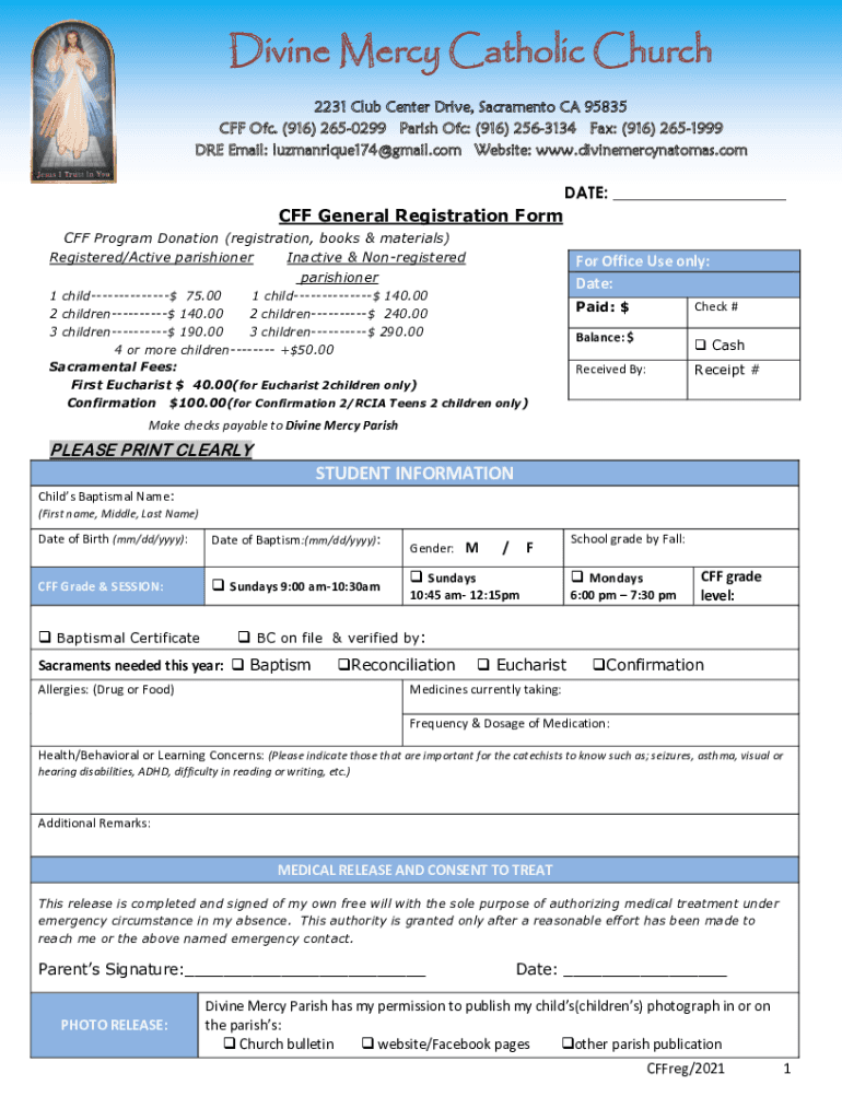 Divine Mercy Catholic Church 2231 Club Center Drive, Sacramento CA 95835 CFF Of. (916) 2650299 Parish Of: (916) 2563134 Fax: (916) 2651999 ARE Email: luzmanrique174 gmail.com Website: www.divinemercynatomas.comDATE: