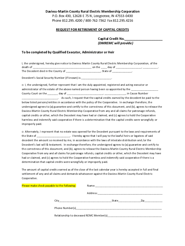 DaviessMartin County Rural Electric Membership Corporation P.O. Box 430, 12628 E 75 N, Loogootee, IN 475530430 Phone 812.295.4200 / 8007627362 Fax 812.295.4216 REQUEST FOR RETIREMENT OF CAPITAL CREDITS