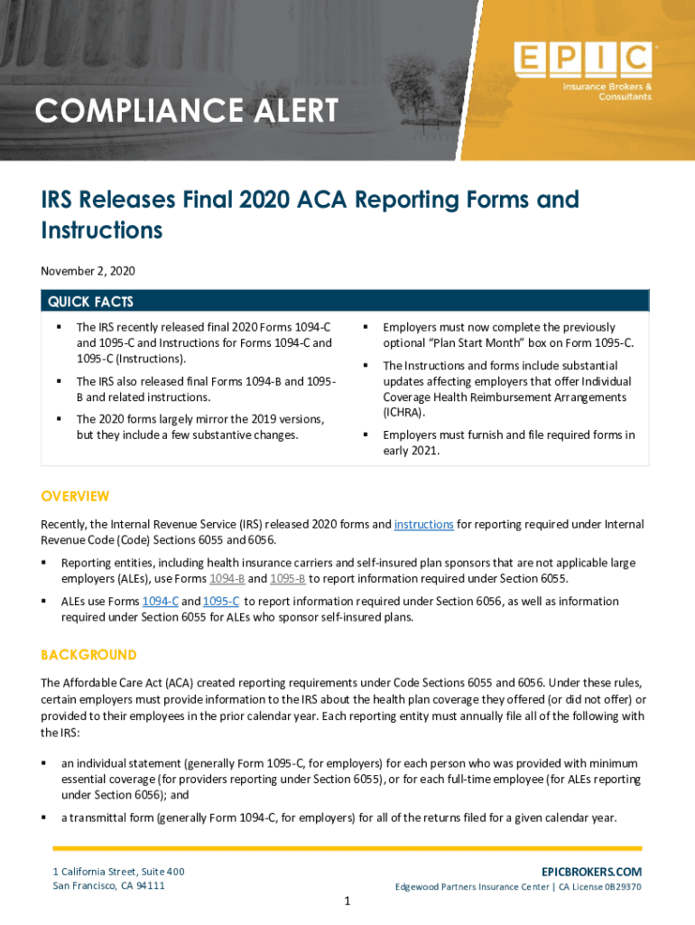 COMPLIANCE ALERT IRS Releases Final 2020 ACA Reporting Forms and Instructions November 2, 2020QUICK FACTS The IRS recently released final 2020 Forms 1094C and 1095C and Instructions for Forms 1094C
