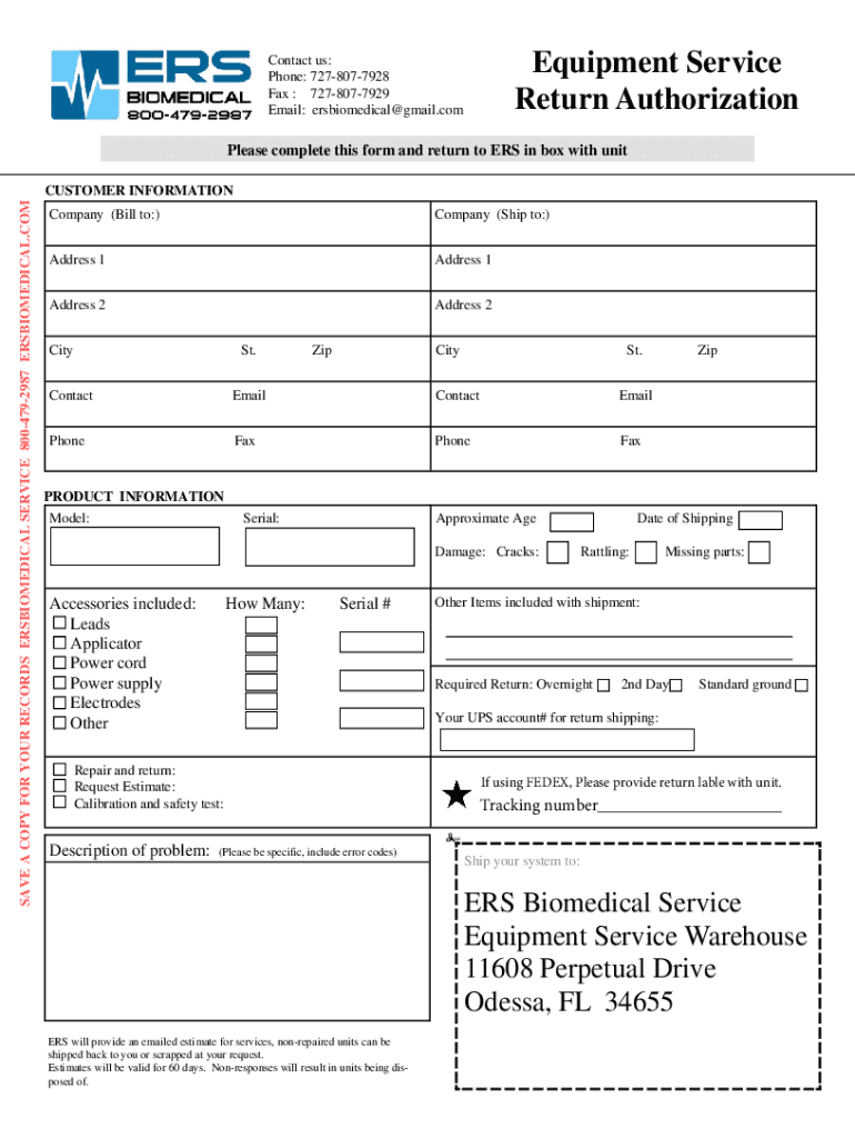 Equipment Service Return AuthorizationContact us: Phone: 7278077928 Fax : 7278077929 Email: ersbiomedical@gmail.comPlease complete this form and return to ERS in box with imprint formulae forgave