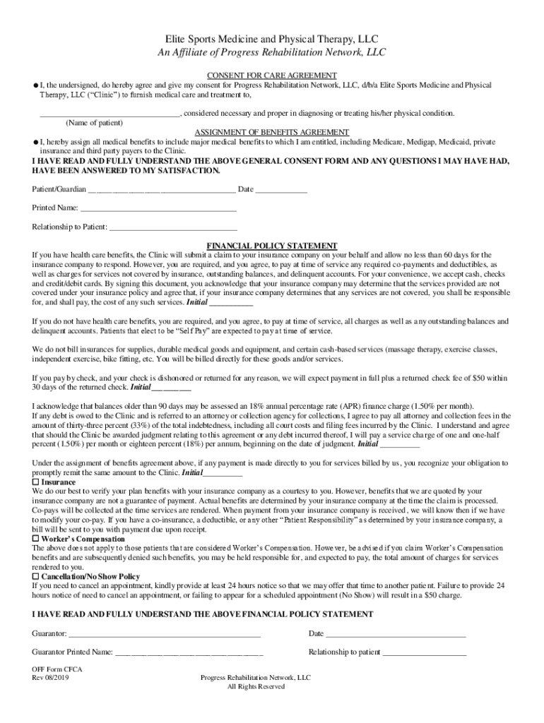 Elite Sports Medicine and Physical Therapy, LLC An Affiliate of Progress Rehabilitation Network, LLC CONSENT FOR CARE AGREEMENT I, the undersigned, do hereby agree and give my consent for Progress
